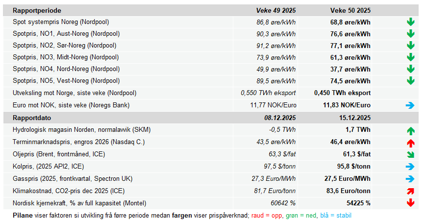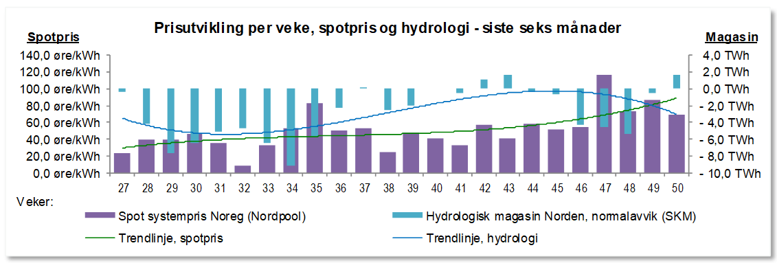 Store variasjonar i vassmengder påverkar både NO4 og NO3, medan produksjonsoverskotet i Nord-Sverige og mykje vindkraft i nord pressar prisane vidare ned.