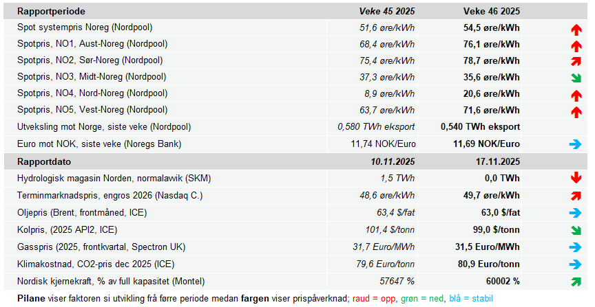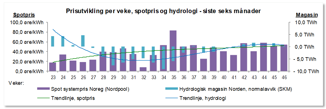 Heile Norden opplever no høge spotprisar som følge av låg vindkraftproduksjon, relativt kaldt vêr og redusert vasskraftproduksjon i Nord-Sverige. Sistnemnde kjem av at elvene er i ferd med å fryse til før vintersesongen. Vassdraga i Nord-Sverige står for om lag 15 prosent av svensk kraftproduksjon, og effekten blir no redusert tilsvarande eitt til to kjernekraftverk for å leggje til rette for innfrysing.